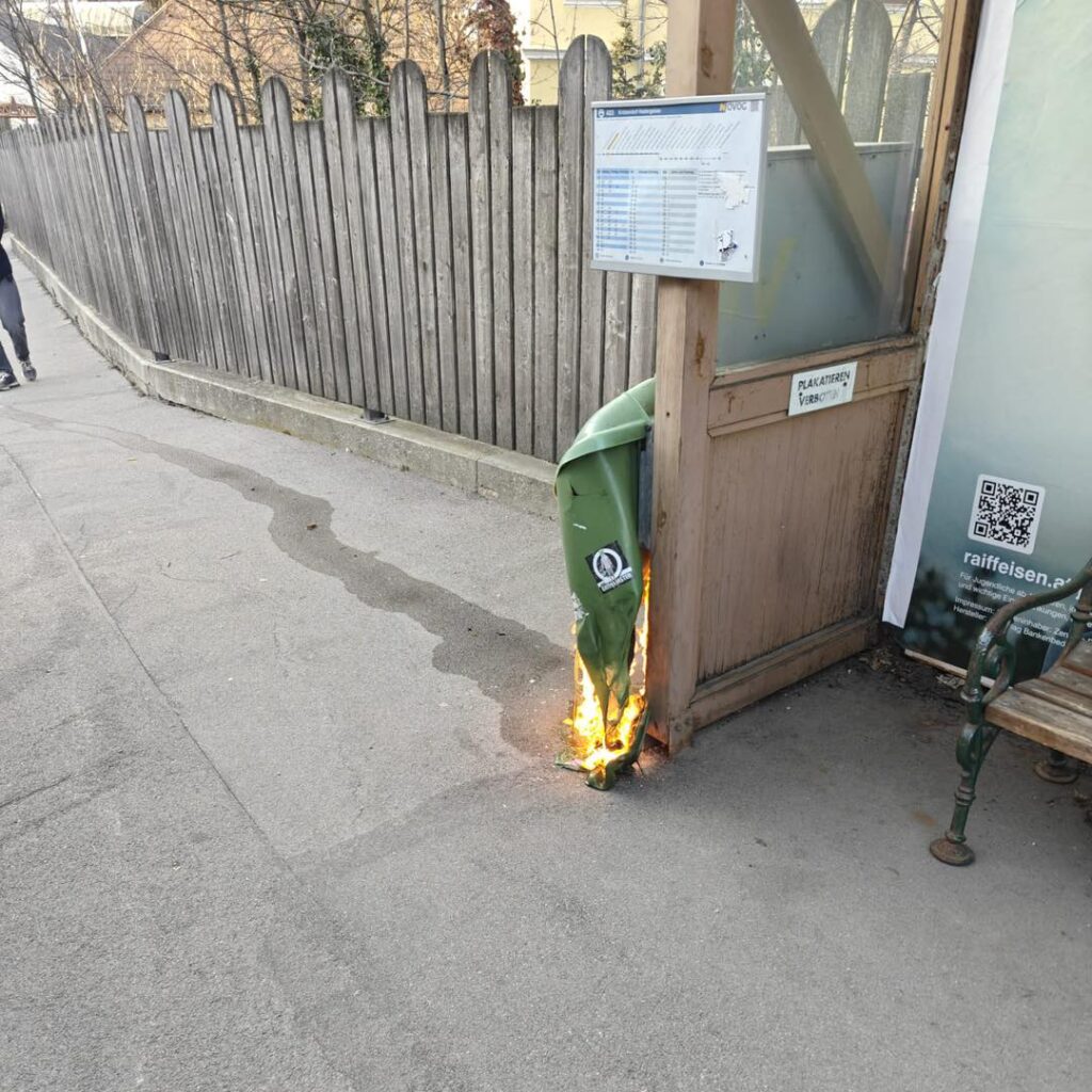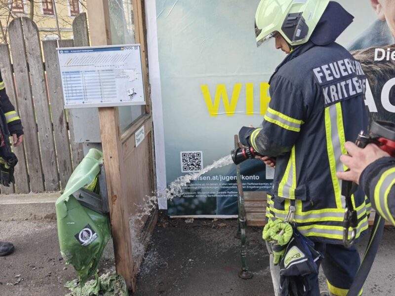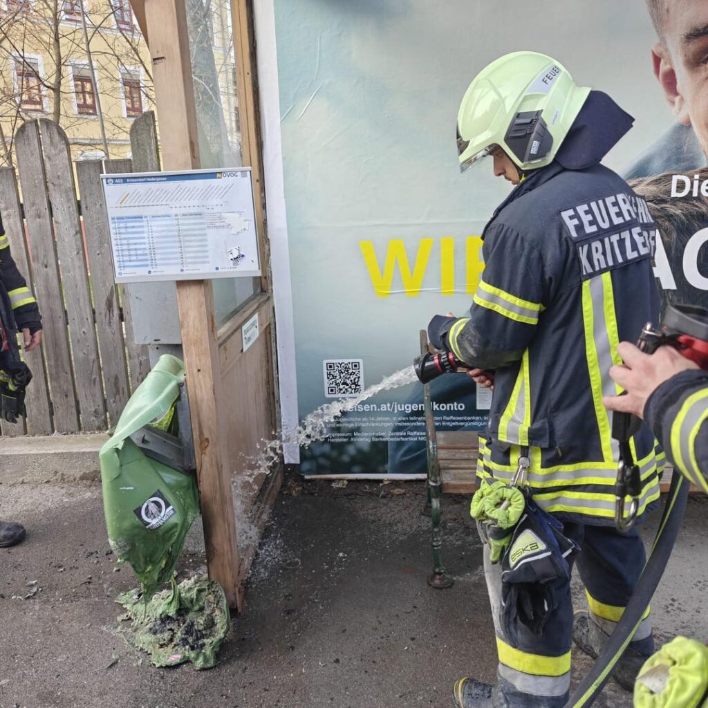 Am 9. März 2026 wurden wir zu einem Müllbehälterbrand zur Bushaltestelle neben der Privatvolksschule Kritzendorf gerufen. Ein Mistkübel hatte Feuer gefangen, bei unserem Eintreffen griffen die Flammen bereits auf das Wartehaus über.